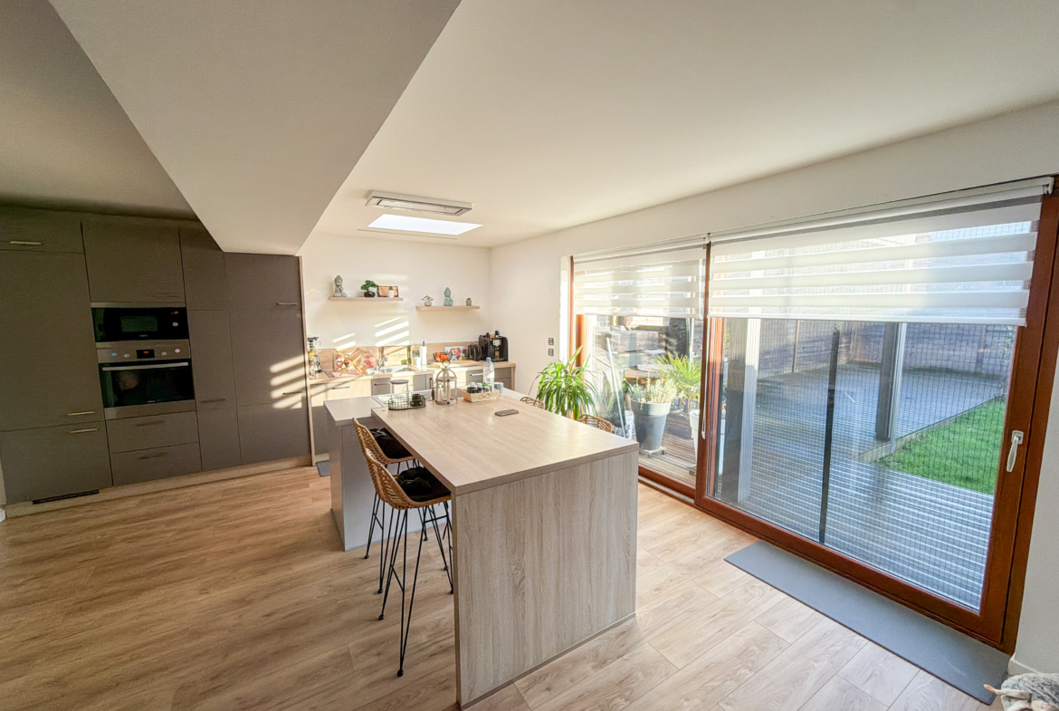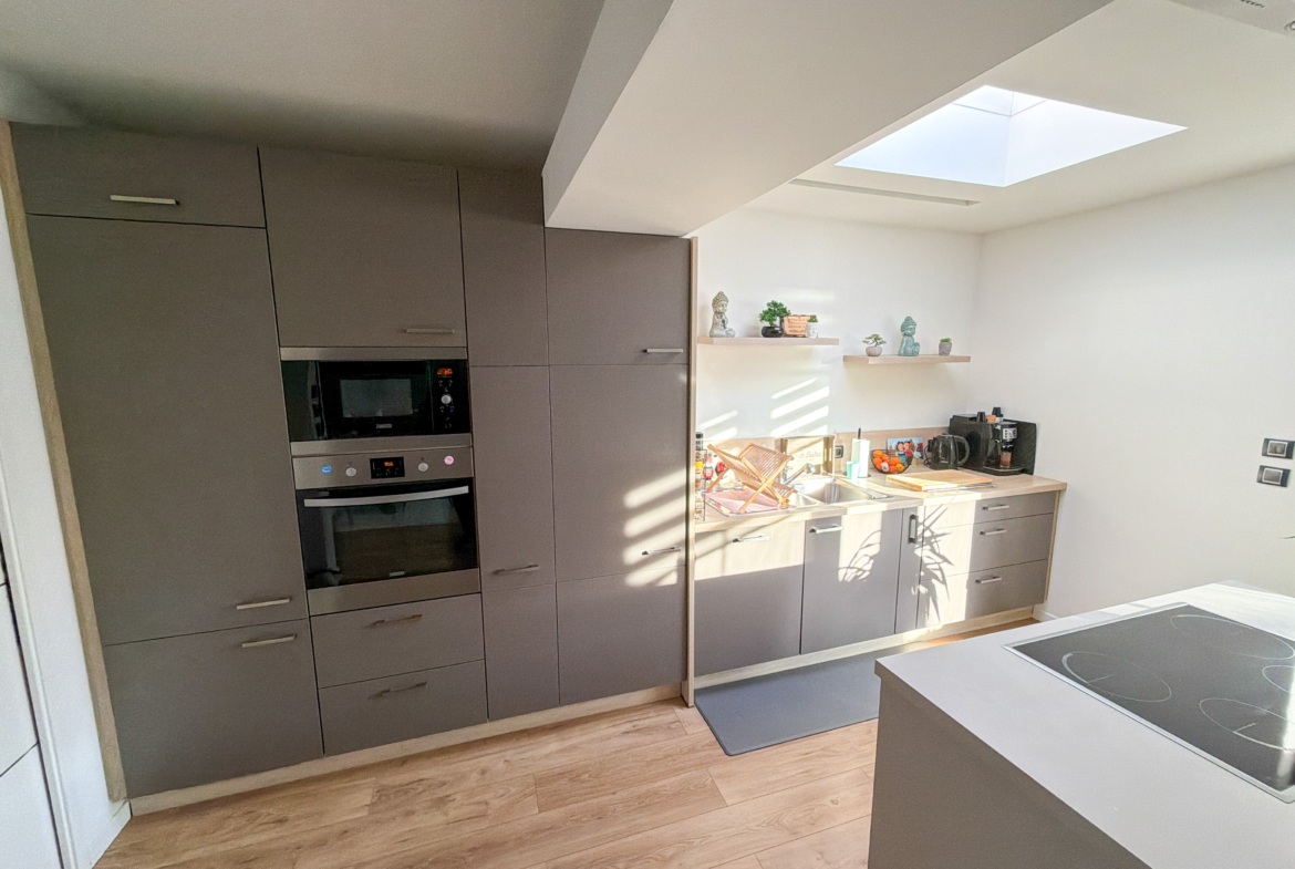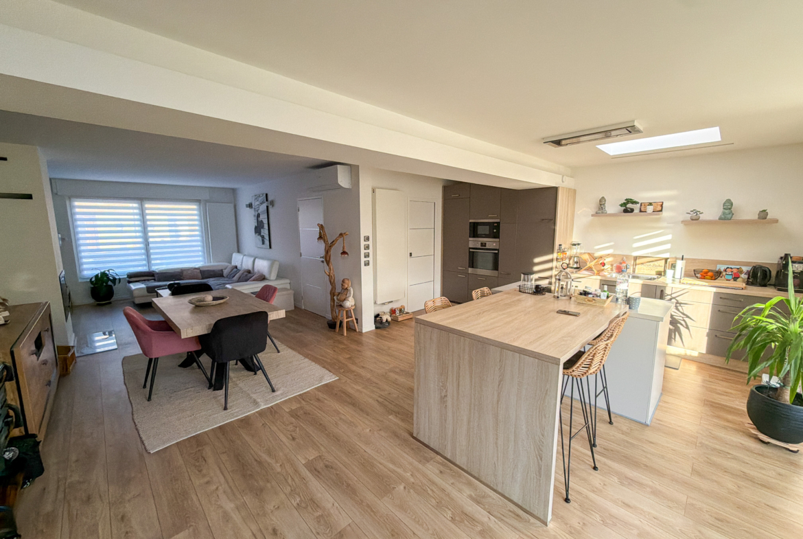 Un grand séjour lumineux ouvert sur une magnifique cuisine équipée, moderne et fonctionnelle